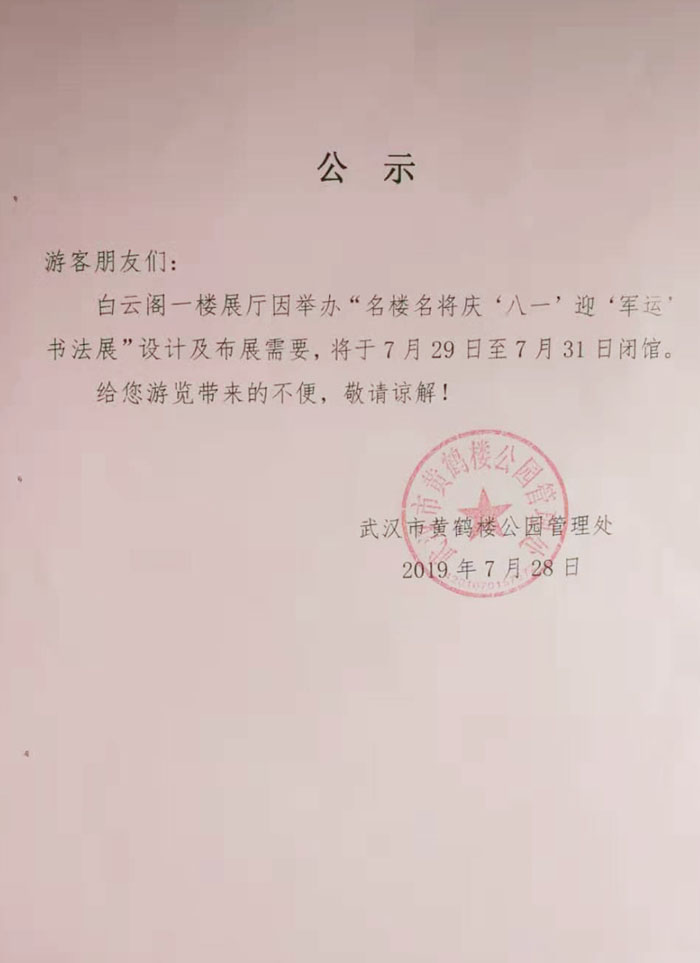 游客朋友们:接上级部门通知,黄鹤楼公园...